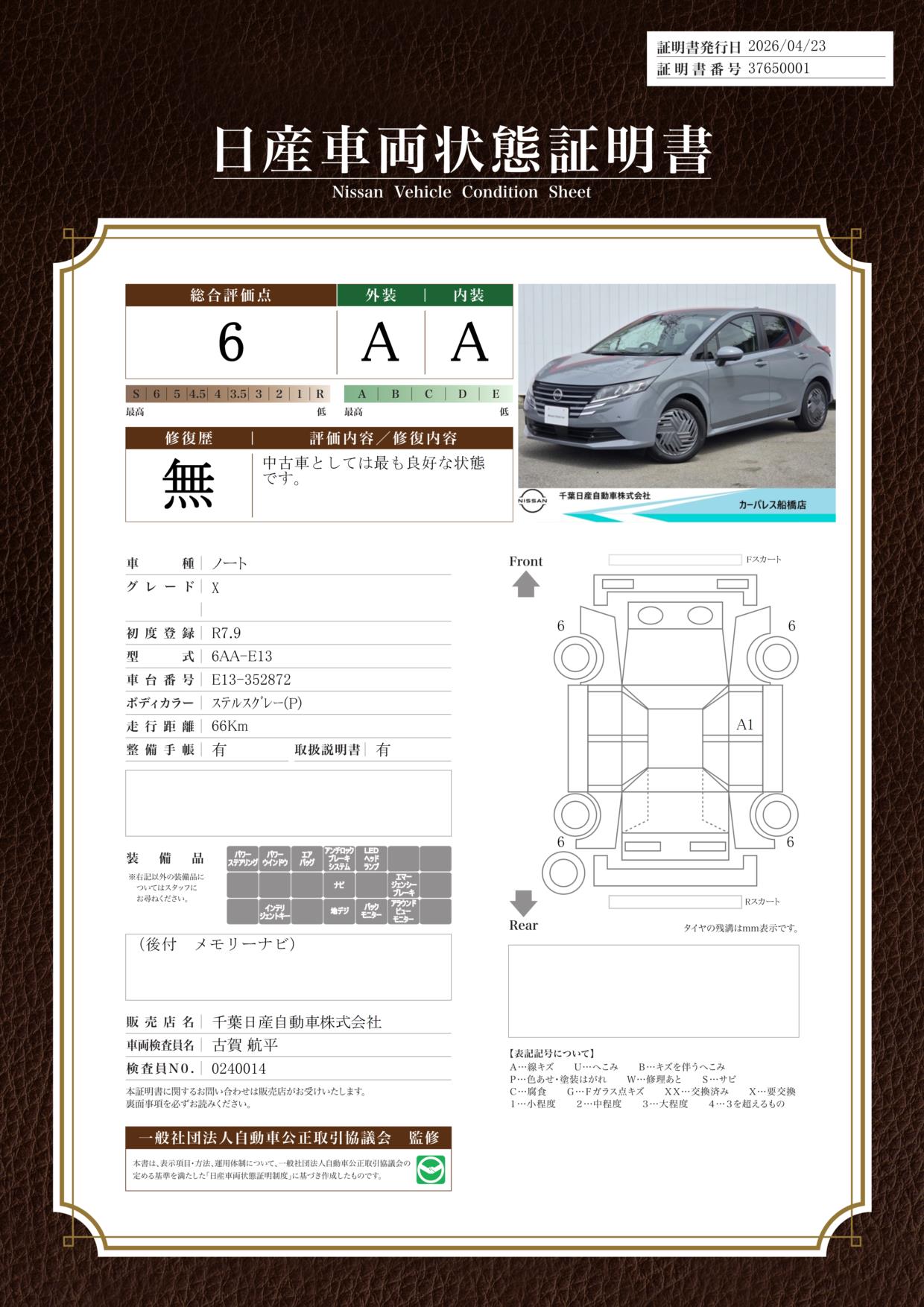 「車両状態証明書」は、査定協会監修のプロの検査員が公正かつ確かな基準で検査した”安心の証”です。
