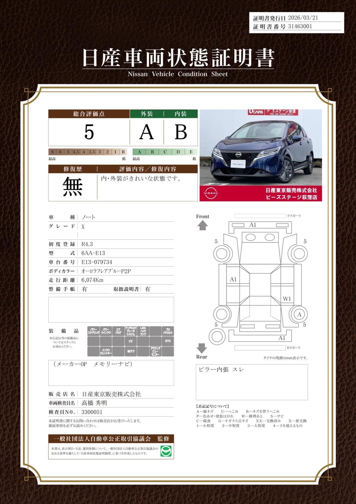 「車両状態証明書」は、査定協会監修のプロの検査員が公正かつ確かな基準で検査した”安心の証”です。