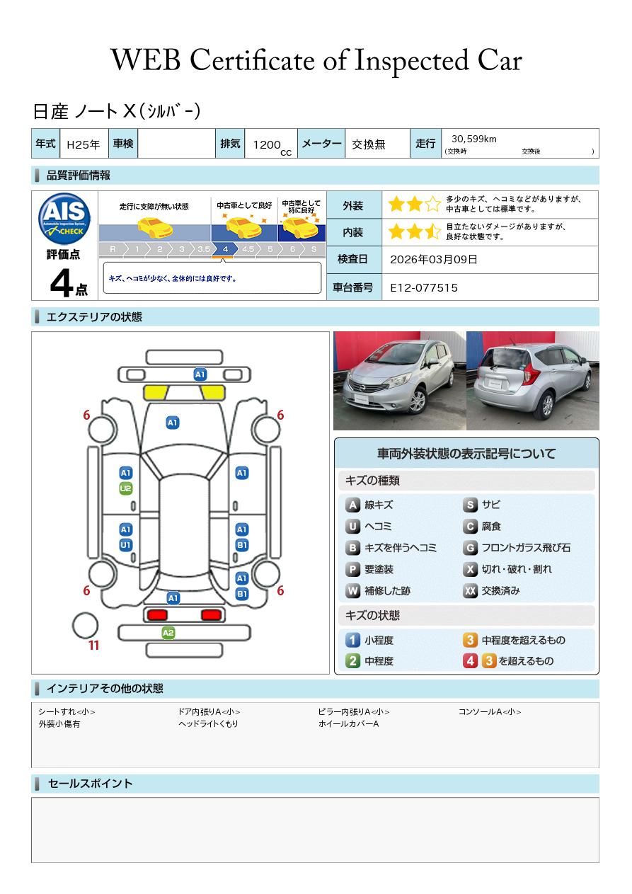 ノート 1200cc 1.2 X ワンオーナー 衝突軽減ブレーキ