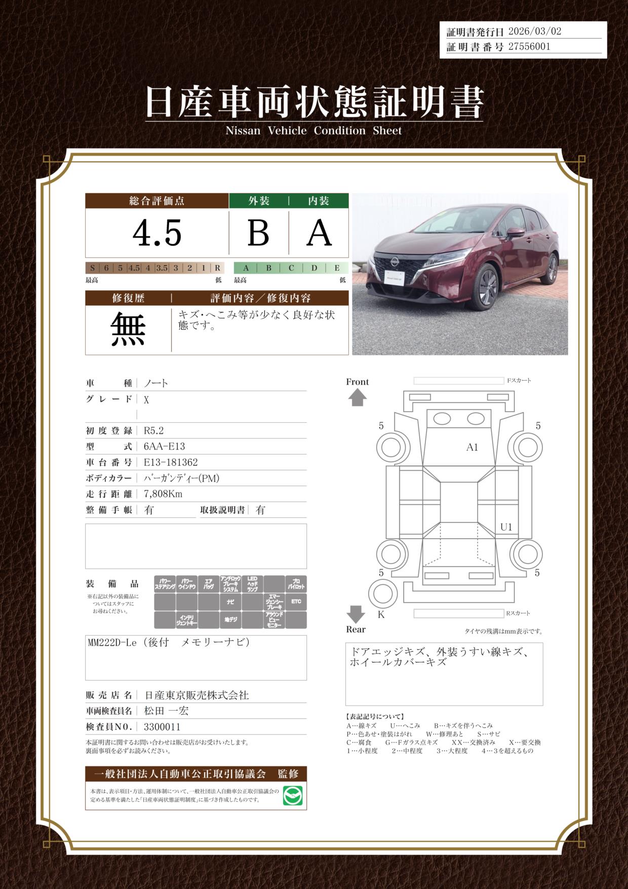 「車両状態証明書」は、査定協会監修のプロの検査員が公正かつ確かな基準で検査した”安心の証”です。