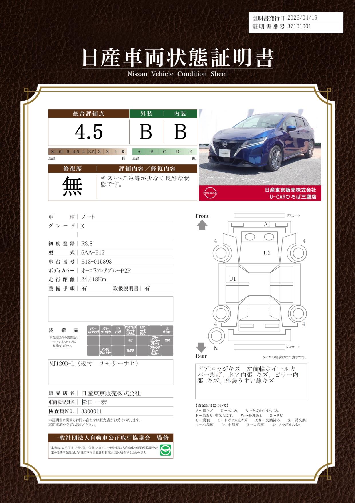 「車両状態証明書」は、査定協会監修のプロの検査員が公正かつ確かな基準で検査した”安心の証”です。