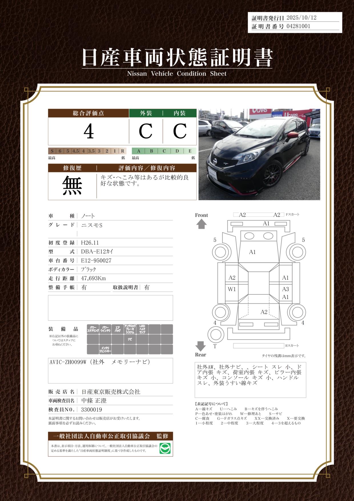 評価機関 : 日産車両状態証明