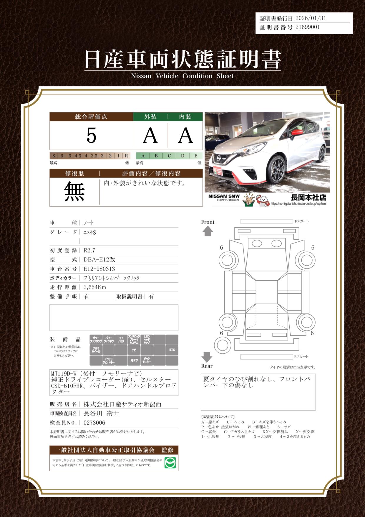 評価機関 : 日産車両状態証明