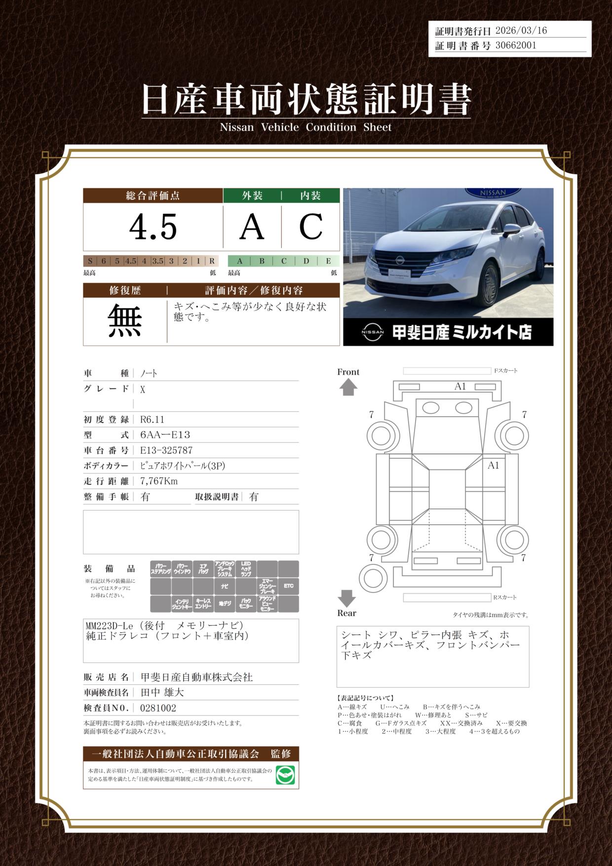 「車両状態証明書」は、査定協会監修のプロの検査員が公正かつ確かな基準で検査した”安心の証”です。