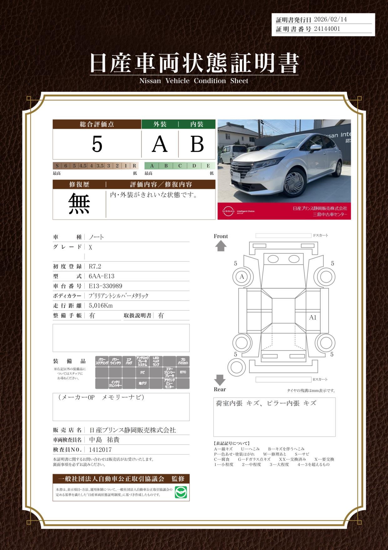 「車両状態証明書」は、査定協会監修のプロの検査員が公正かつ確かな基準で検査した”安心の証”です。