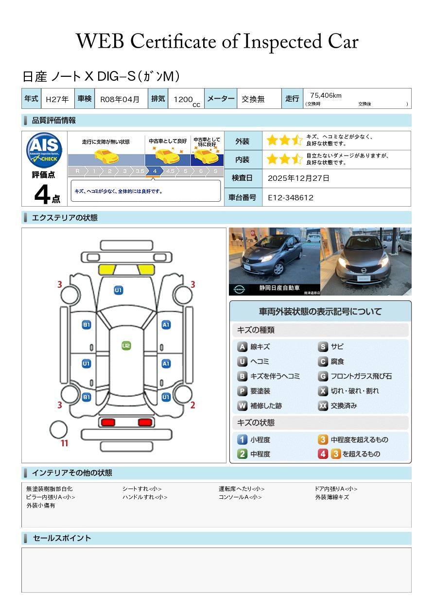 ノート 1200cc 1.2 X DIG-S メモリーナビゲーション