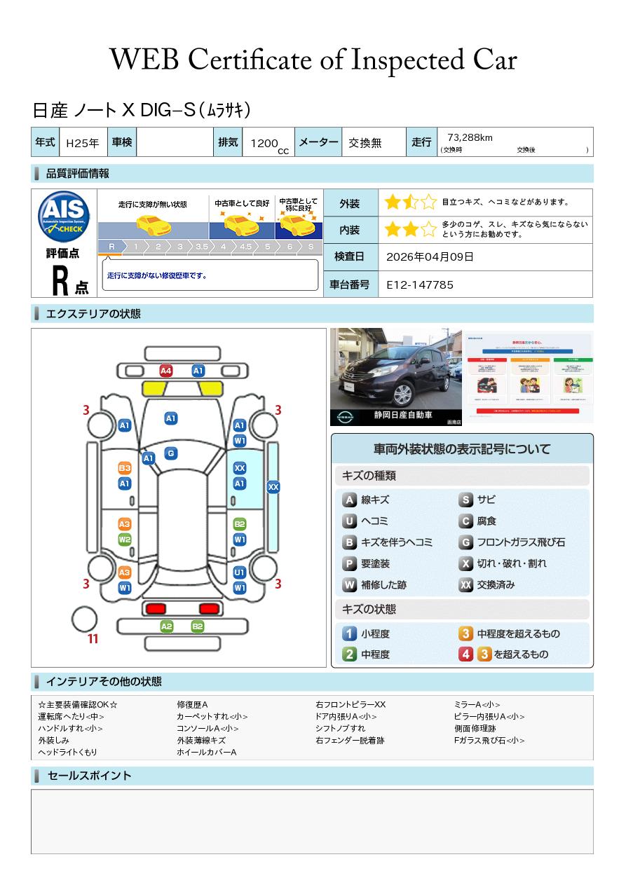 現状括弧書き内の年月まで車検有効期限が残っていますが、ご成約時に新しく車検を取り直します。なお取り直しの費用は車両価格に含まれています。