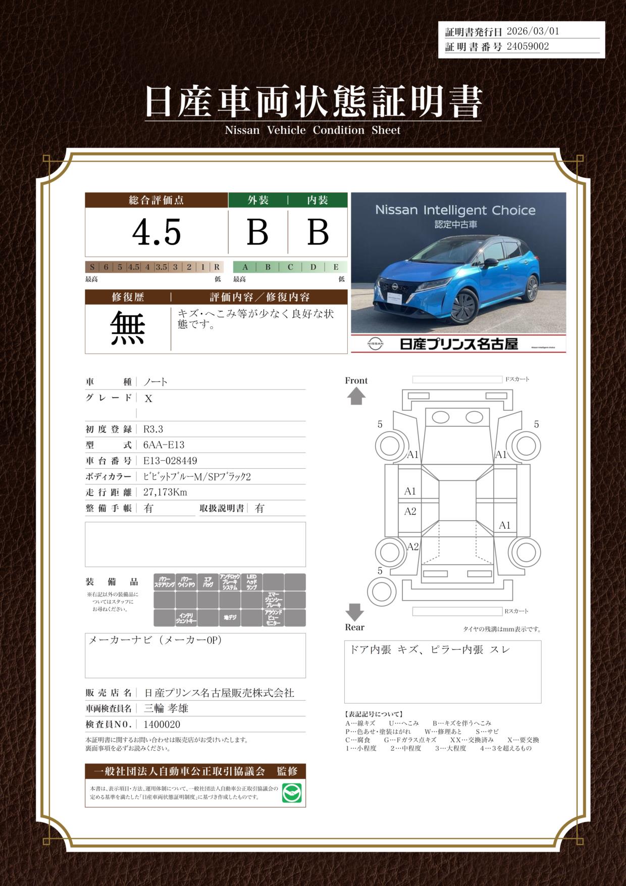 現状括弧書き内の年月まで車検有効期限が残っていますが、ご成約時に新しく車検を取り直します。なお取り直しの費用は車両価格に含まれています。