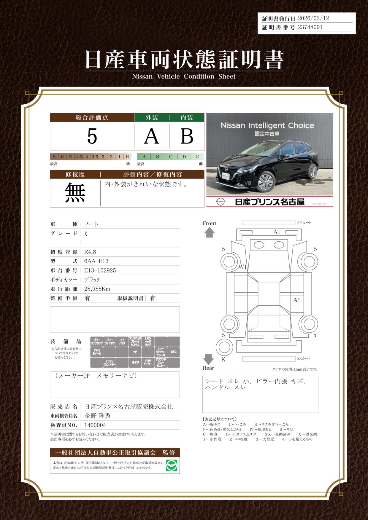 評価機関 : 日産車両状態証明