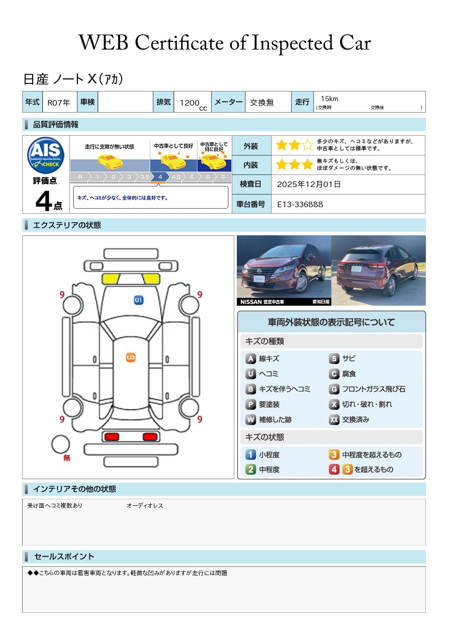 ノート 1200cc 1.2 X 雹害車両 全周囲カメラ LEDライト