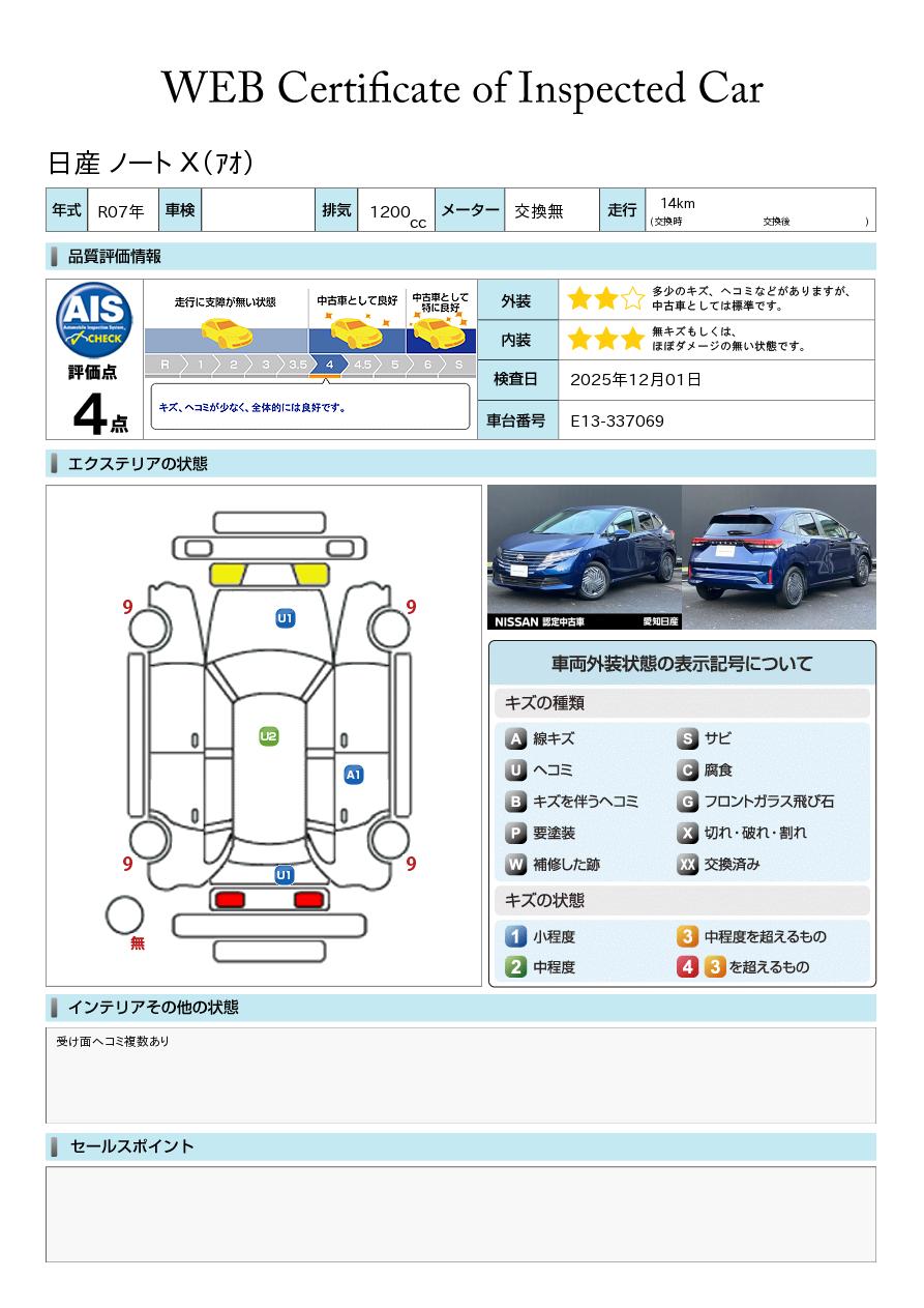 こちらのノートは【雹害車】となります!現車確認をお願いいたします!安全装備・先進装備が充実したノートX!LEDライトや全周囲カメラ搭載で運転しやすく走行14kmの良質車です。