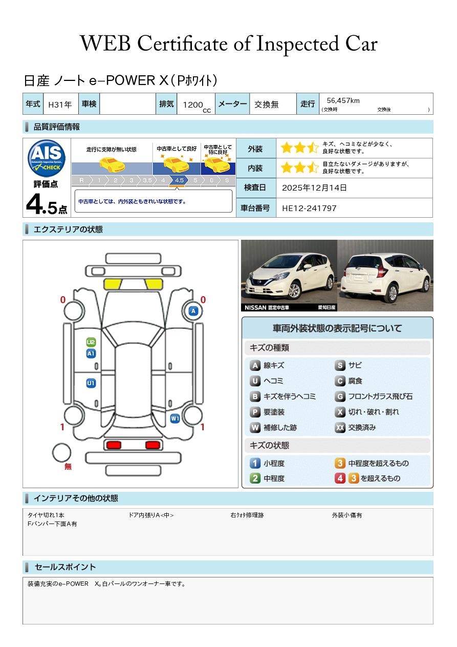 装備充実のe-POWER X。白パールのワンオーナー車です。きれいな白パールで、安心の先進安全装備も多数。低燃費と走りの良さを両立した人気のe-POWERモデルです。