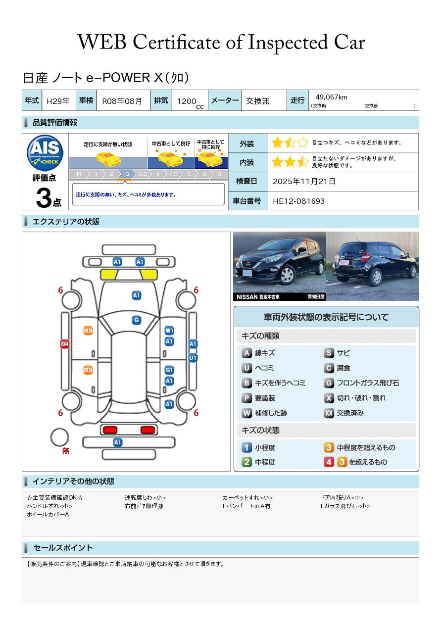 ノート 1200cc 1.2 X 雹害車両 全周囲カメラ LEDライト