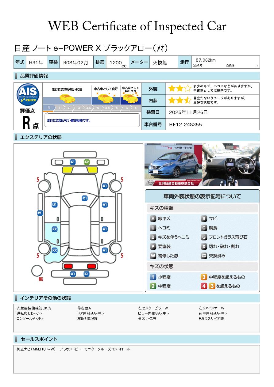 ノート 1200cc 1.2 e-POWER X ブラックアロー 純正ナビ 全周囲カメラ
