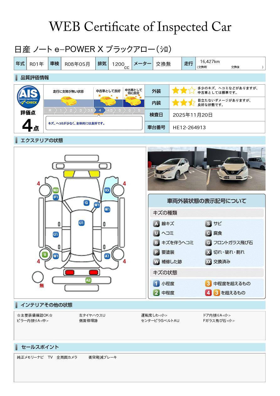 ノート 1200cc 1.2 e-POWER X ブラックアロー 純正メモリーナビ TV 全周囲カメラ