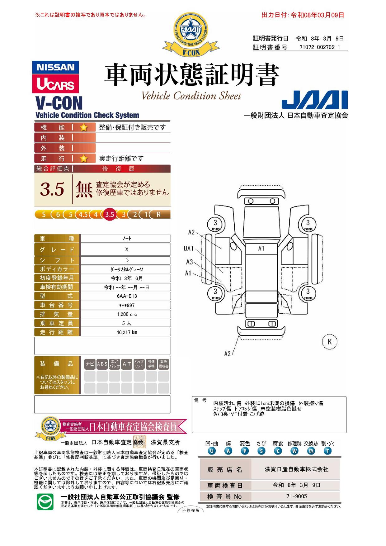 現状括弧書き内の年月まで車検有効期限が残っていますが、ご成約時に新しく車検を取り直します。なお取り直しの費用は車両価格に含まれています。