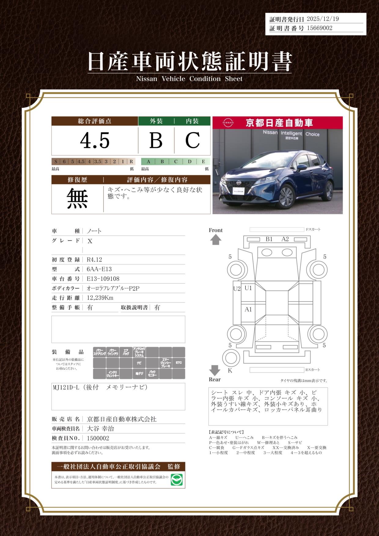 純正ナビMJ121D-Lバックカメラワンオーナー当店では、ご安心頂く為に、ご来店頂きお車のご確認をおススメしております。