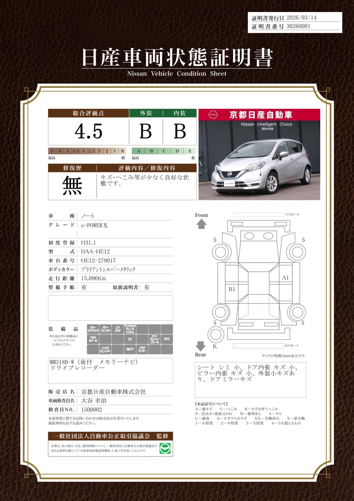 現状括弧書き内の年月まで車検有効期限が残っていますが、ご成約時に新しく車検を取り直します。なお取り直しの費用は車両価格に含まれています。