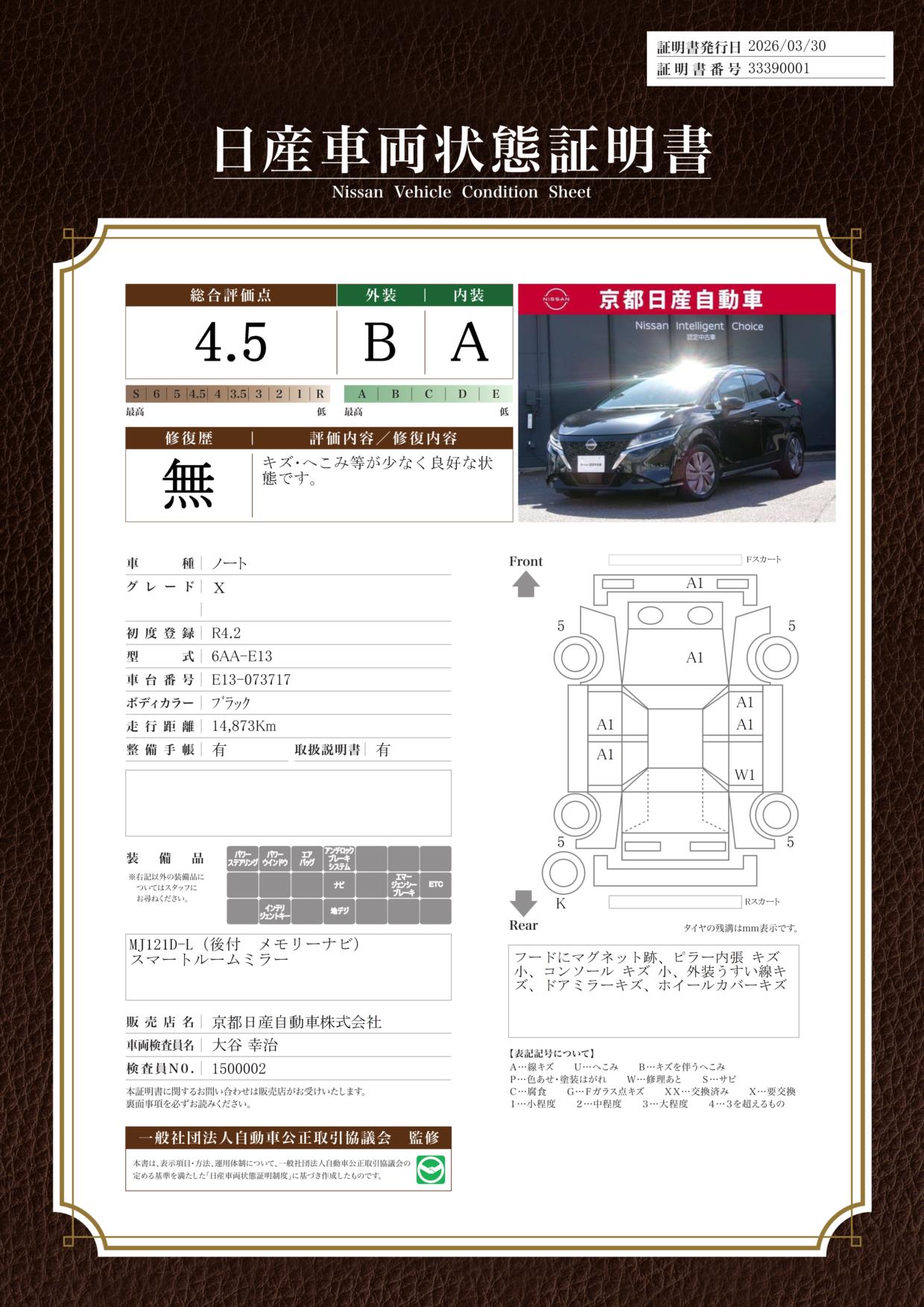 「車両状態証明書」は、査定協会監修のプロの検査員が公正かつ確かな基準で検査した”安心の証”です。