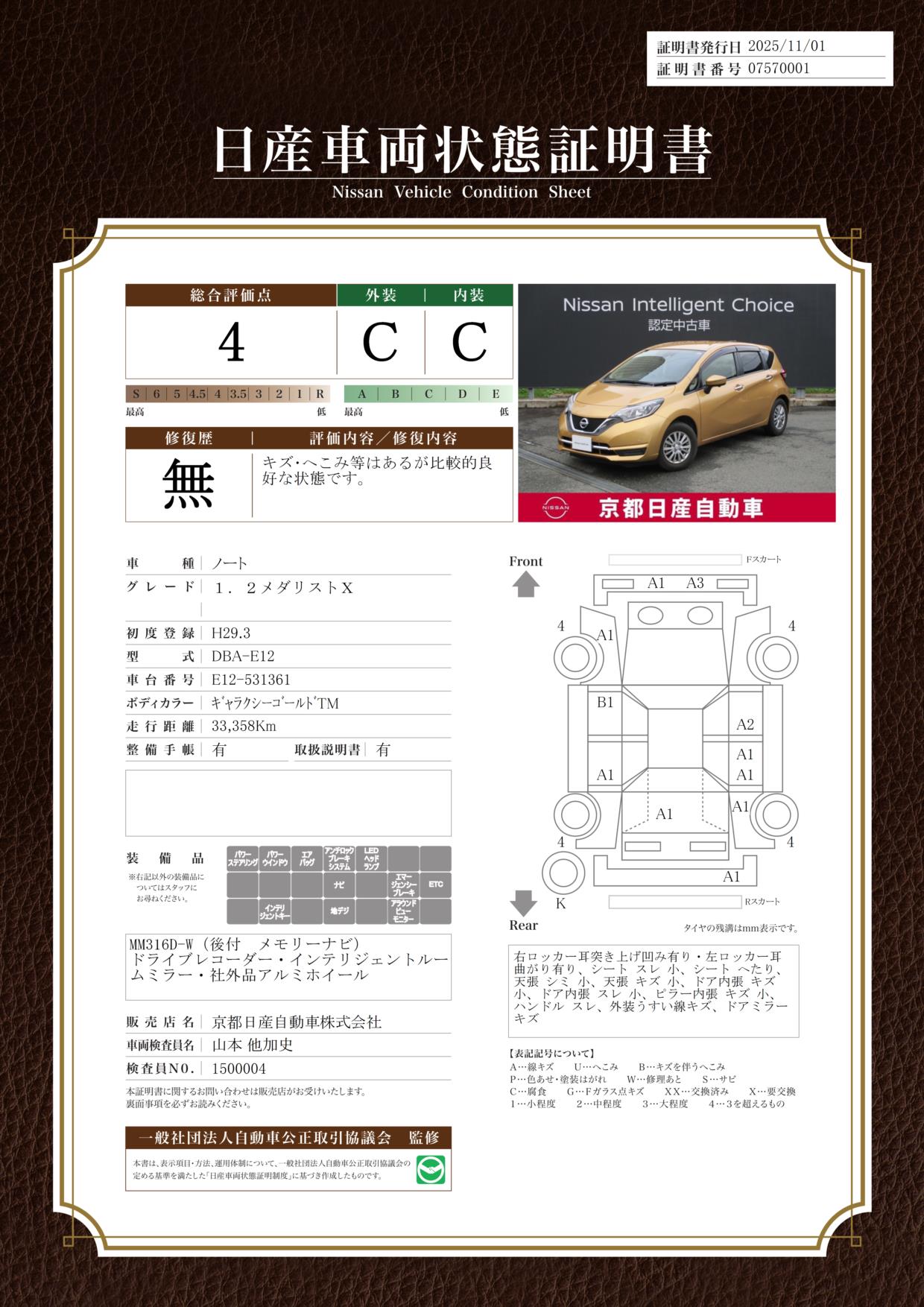 ノート 1200cc 1.2 X 純正ナビ AVM ドラレコ前後室内 ETC2.0
