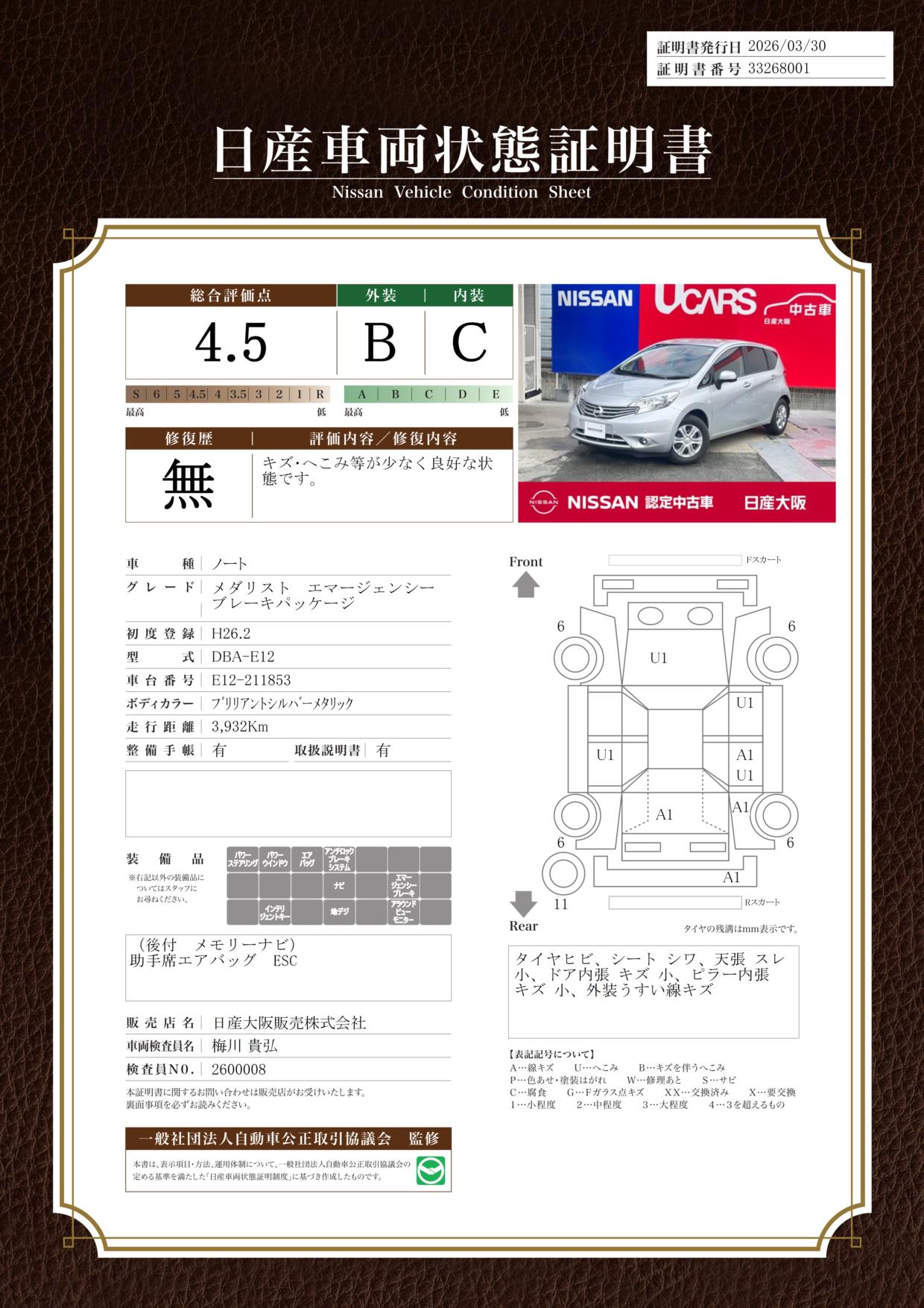 日産大阪UCARS枚方『日産中古車ワイド保証12ケ月』:延長保証もございます。エマージェンシーブレーキ・前後踏間違防止・アラウンドモニタ&ナビTV・日産中古車ワイド保証12ケ月