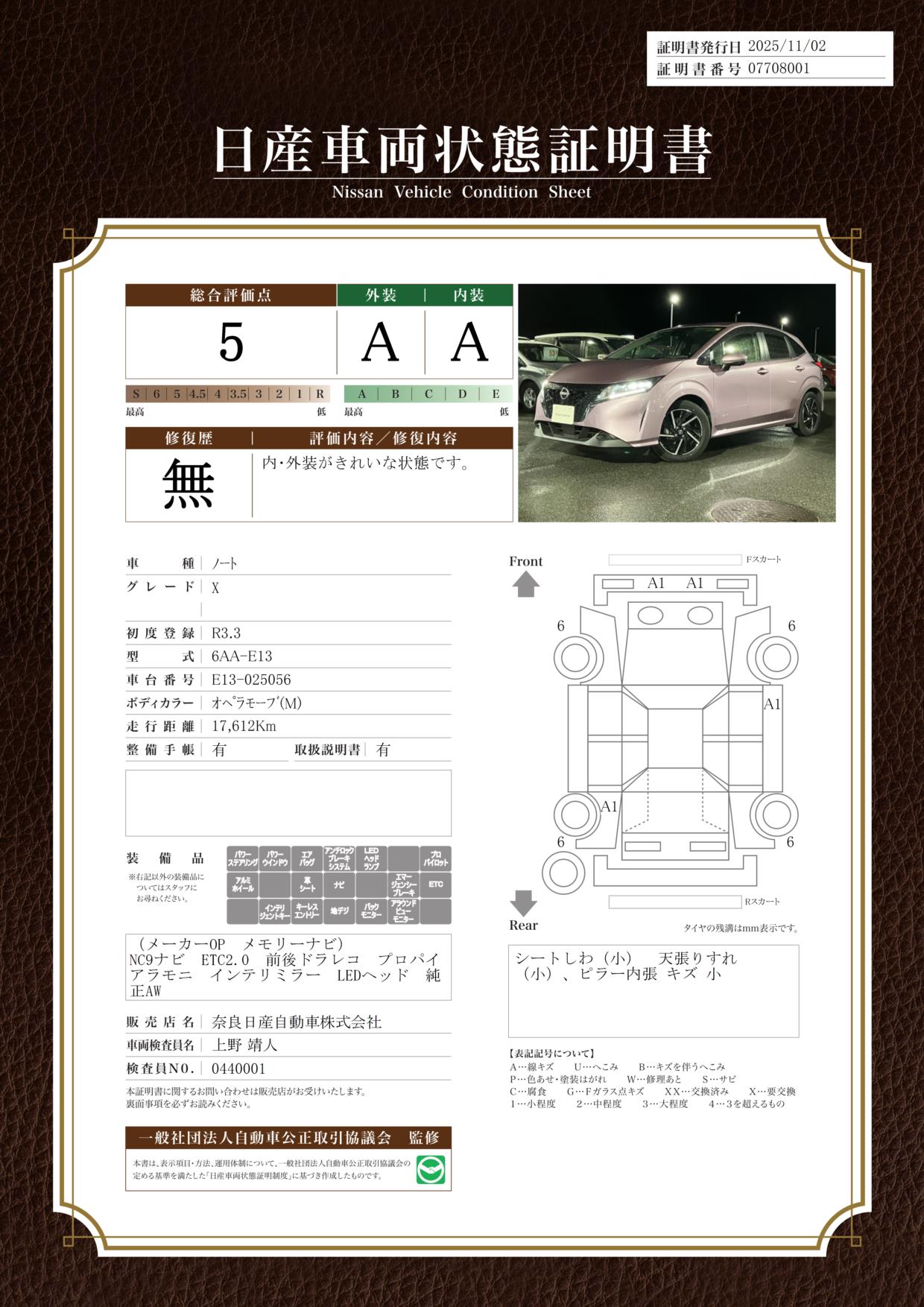 奈良日産中古車!奈良・大阪・京都・兵庫・和歌山・滋賀!その他全国対応可能NC9ナビ ETC2.0 前後ドラレコ プロパイ アラモニ インテリミラー LEDヘッド 純正AW 本革シート