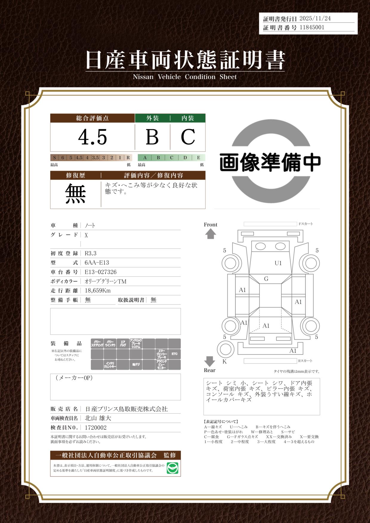 評価機関 : 日産車両状態証明