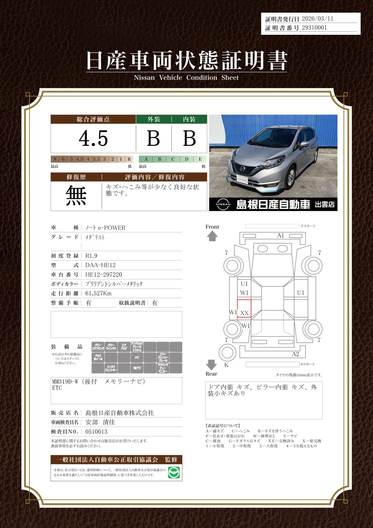 日産車両状態証明
