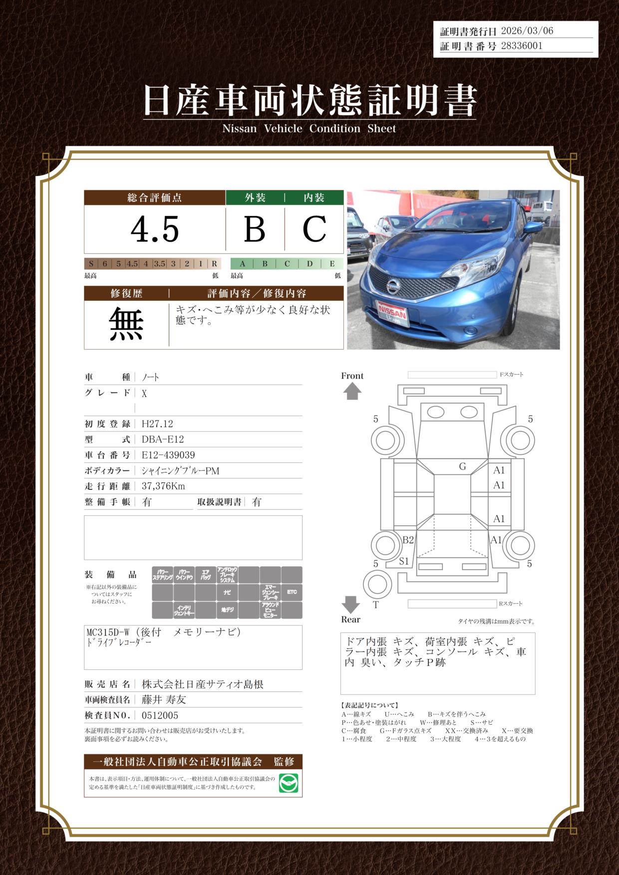 ノート 1200cc 1.2 X 90周年記念車 自社社用車 全周囲カメラ 踏み間違い防止