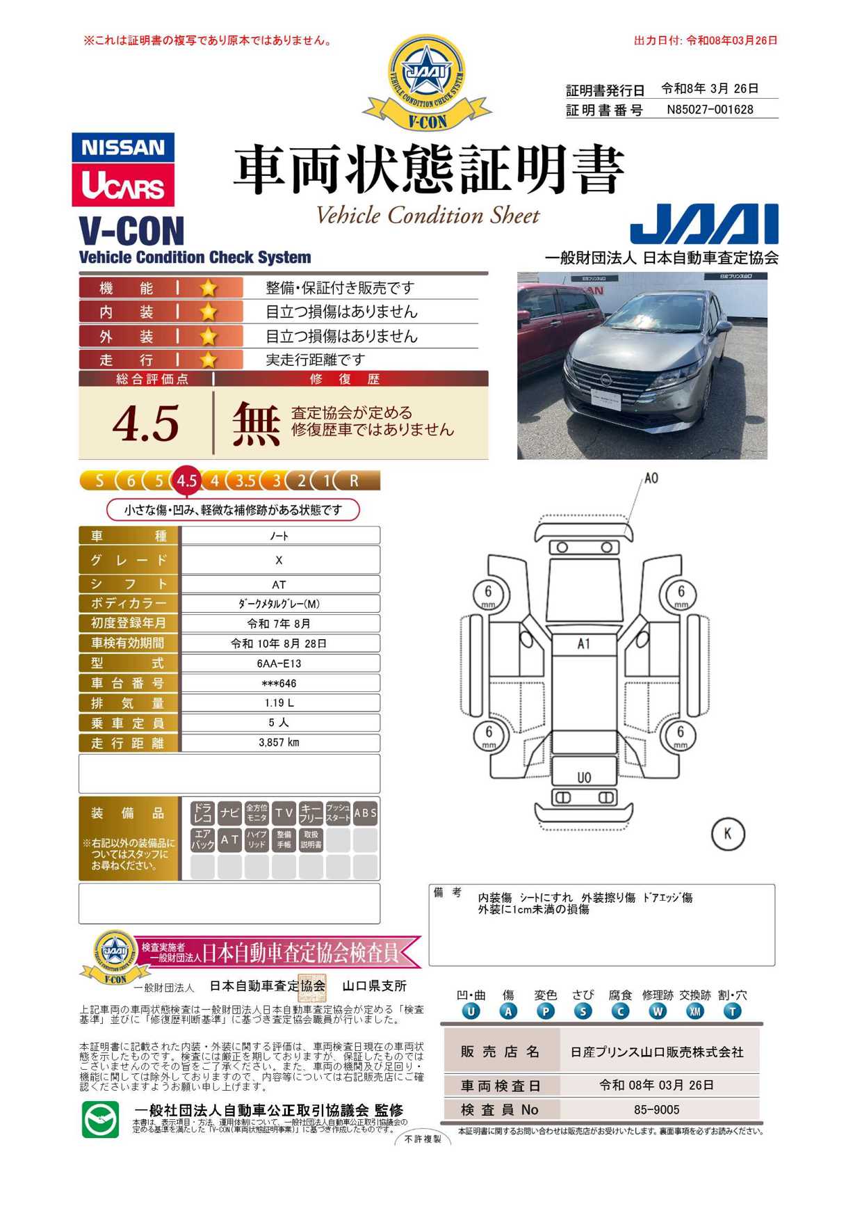 「車両状態証明書」は、査定協会監修のプロの検査員が公正かつ確かな基準で検査した”安心の証”です。