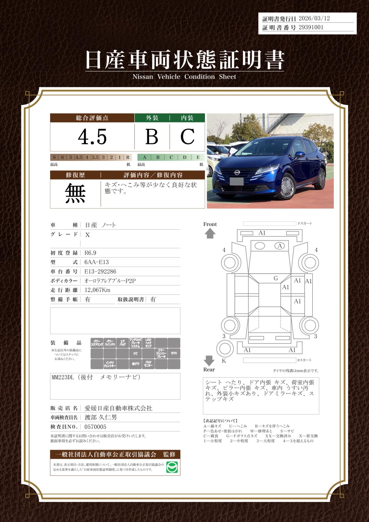 「車両状態証明書」は、査定協会監修のプロの検査員が公正かつ確かな基準で検査した”安心の証”です。