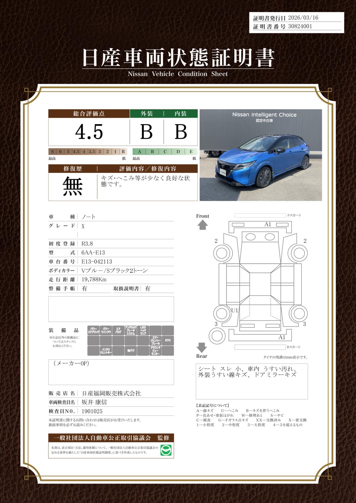 「車両状態証明書」は、査定協会監修のプロの検査員が公正かつ確かな基準で検査した”安心の証”です。