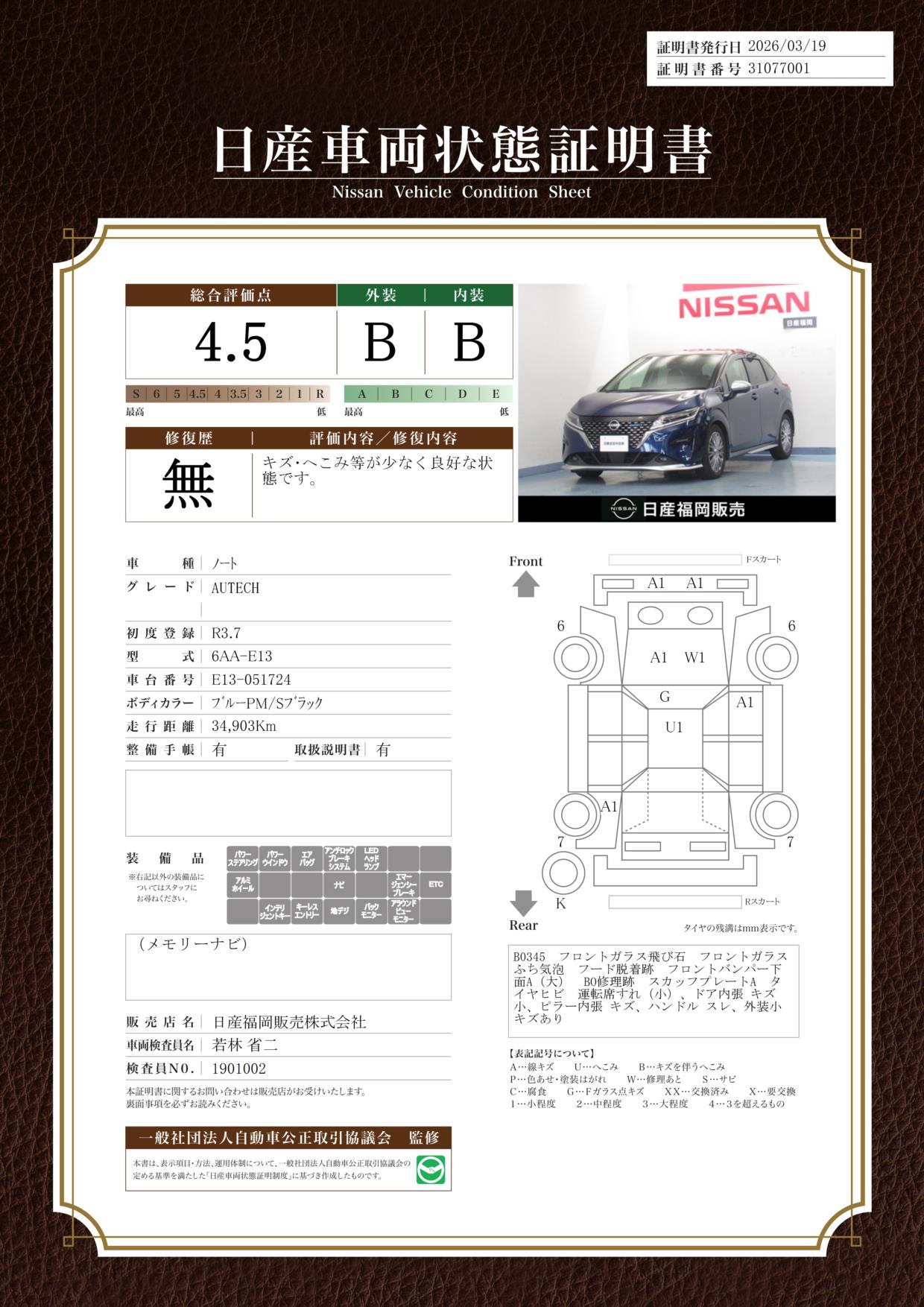 こちらのクルマは 「日産プレミアム認定中古車」。 だから、4つの安心をお約束。