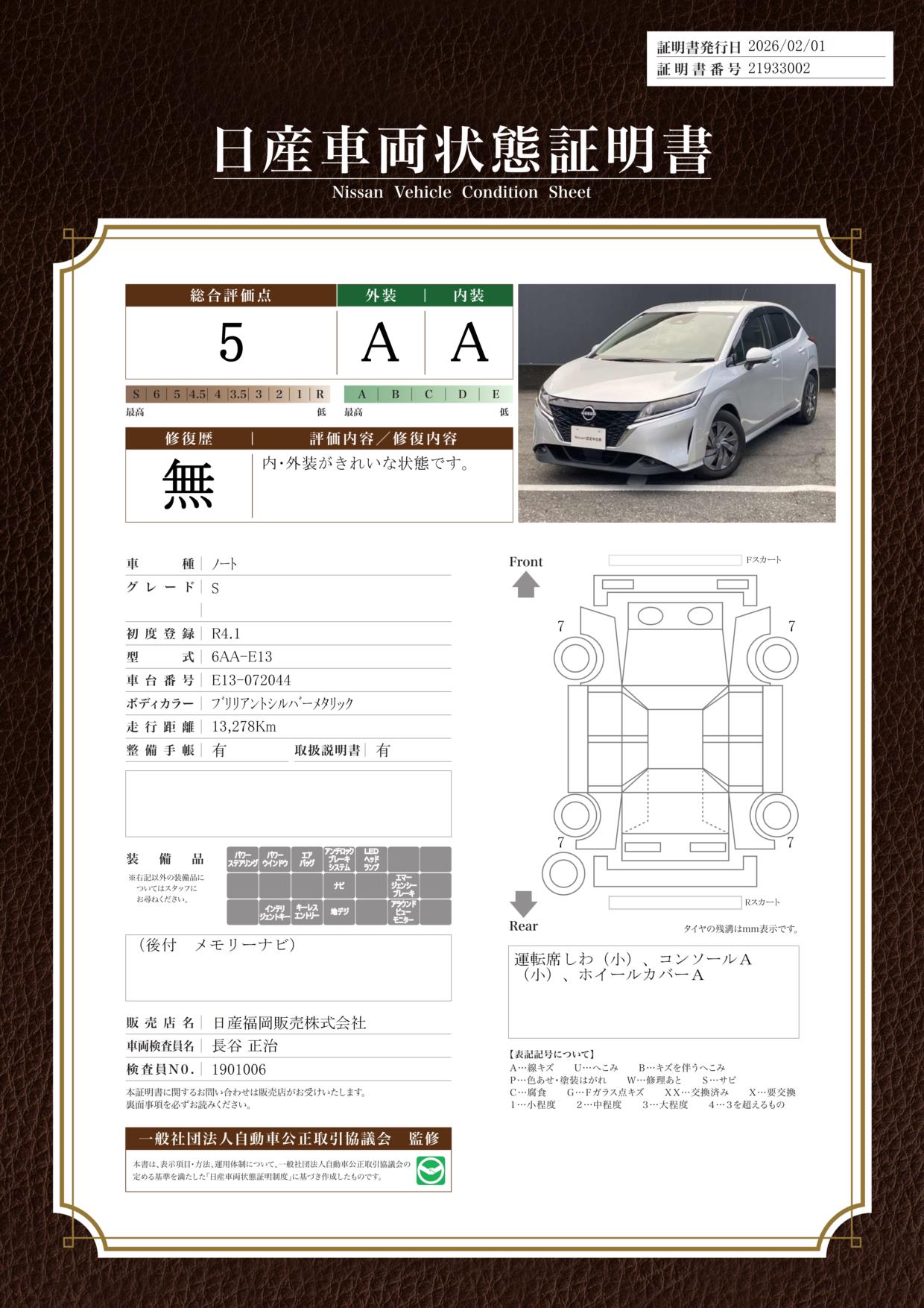 現状括弧書き内の年月まで車検有効期限が残っていますが、ご成約時に新しく車検を取り直します。なお取り直しの費用は車両価格に含まれています。