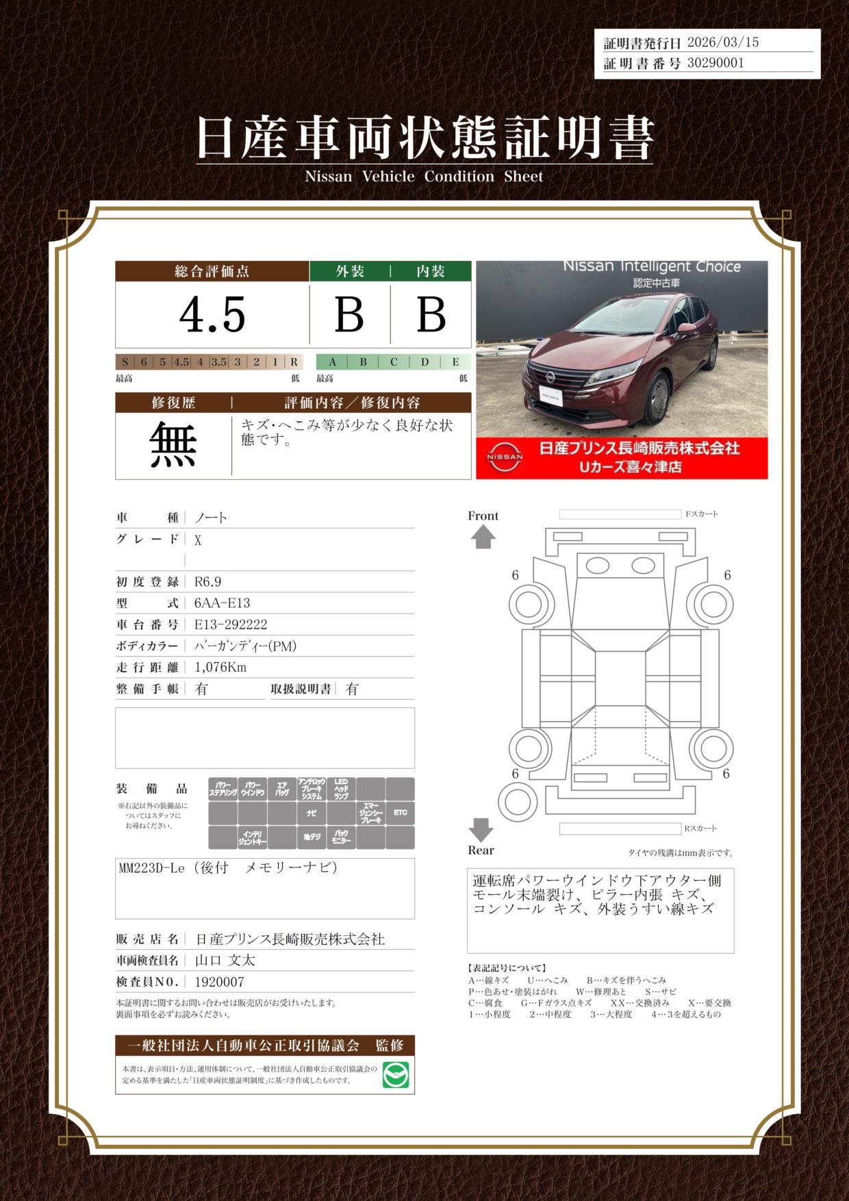 「車両状態証明書」は、査定協会監修のプロの検査員が公正かつ確かな基準で検査した”安心の証”です。