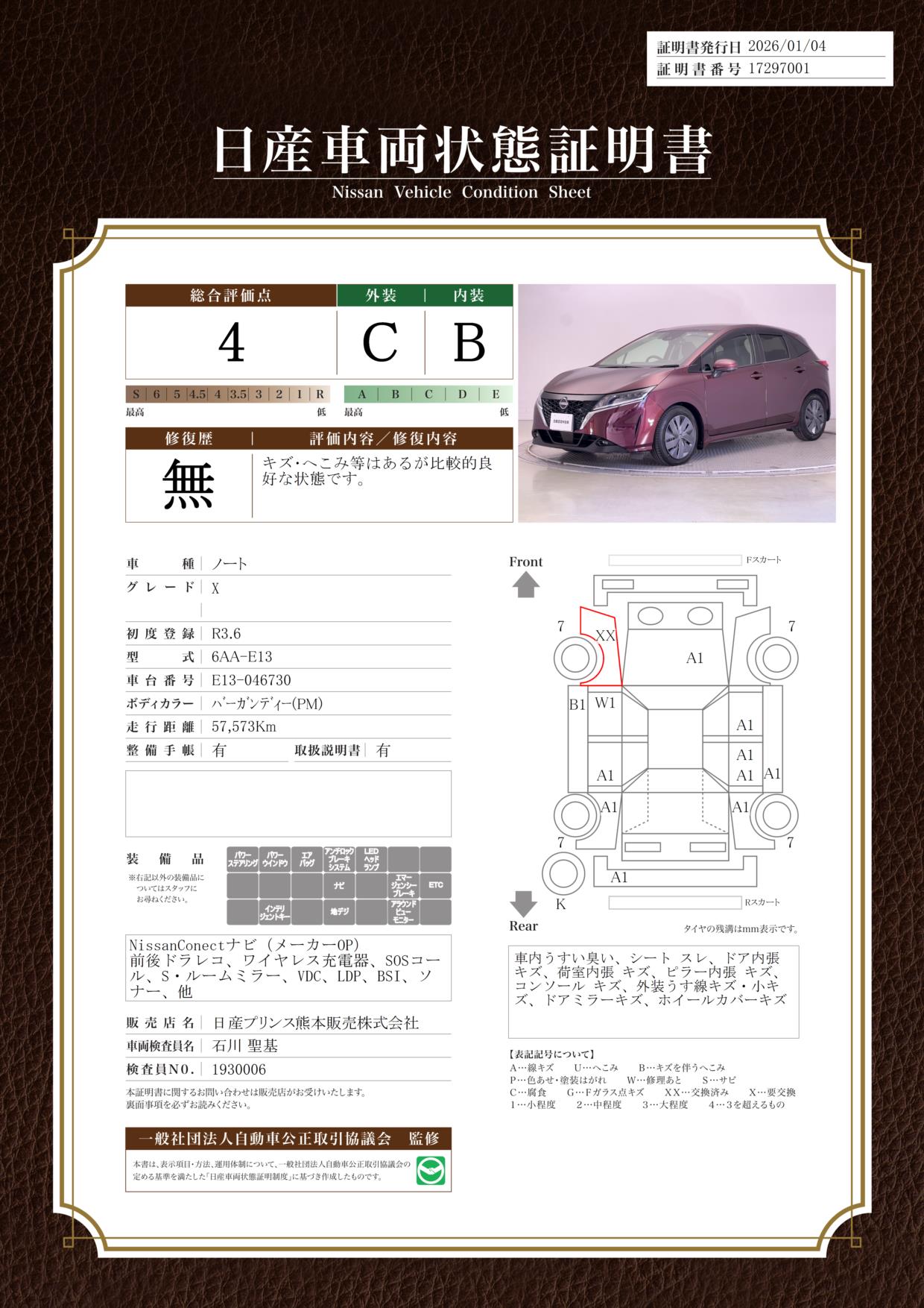 現状括弧書き内の年月まで車検有効期限が残っていますが、ご成約時に新しく車検を取り直します。なお取り直しの費用は車両価格に含まれています。