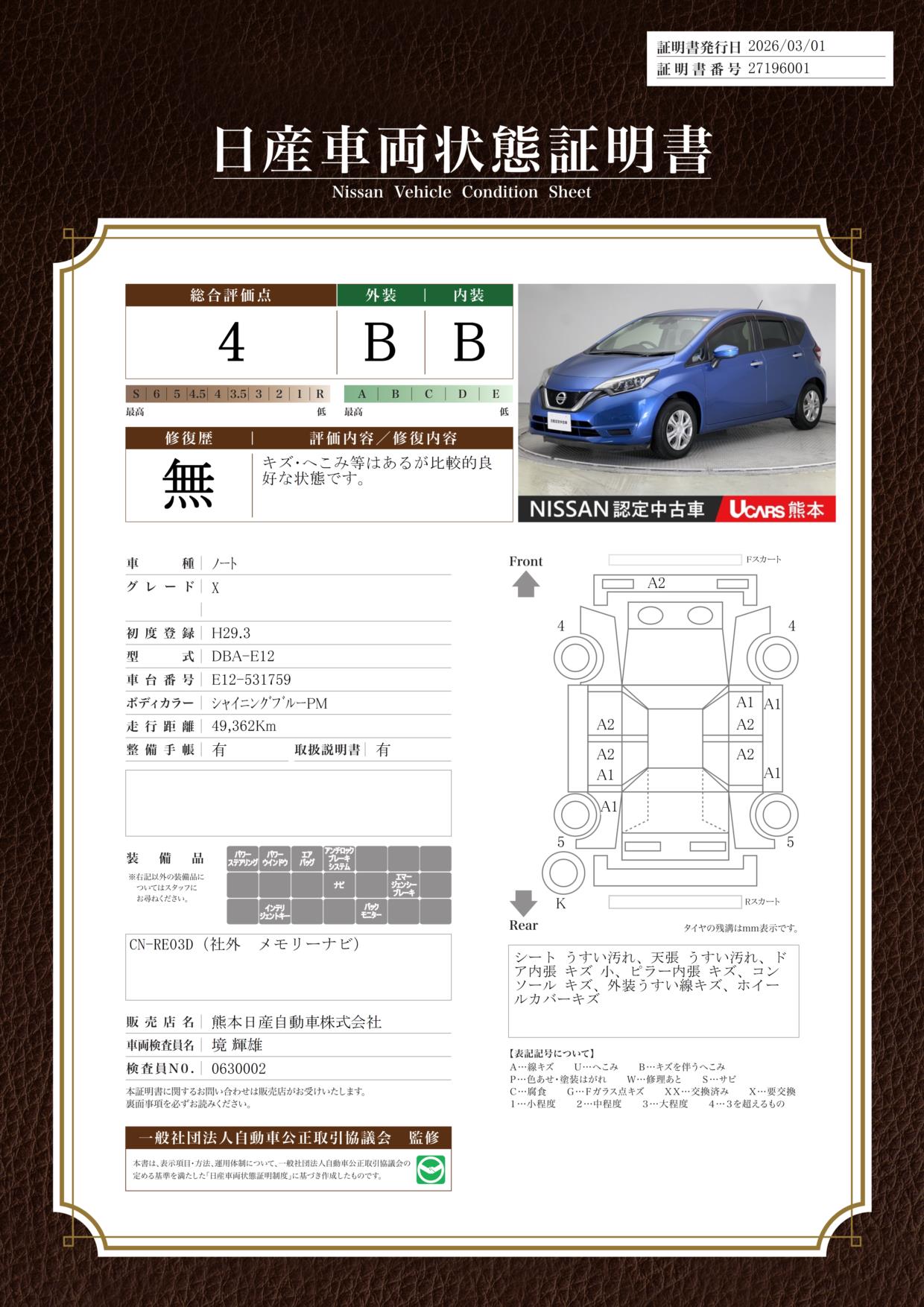 ノート 1200cc 1.2 X メモリーナビ フルセグTV ディーラー保証 B