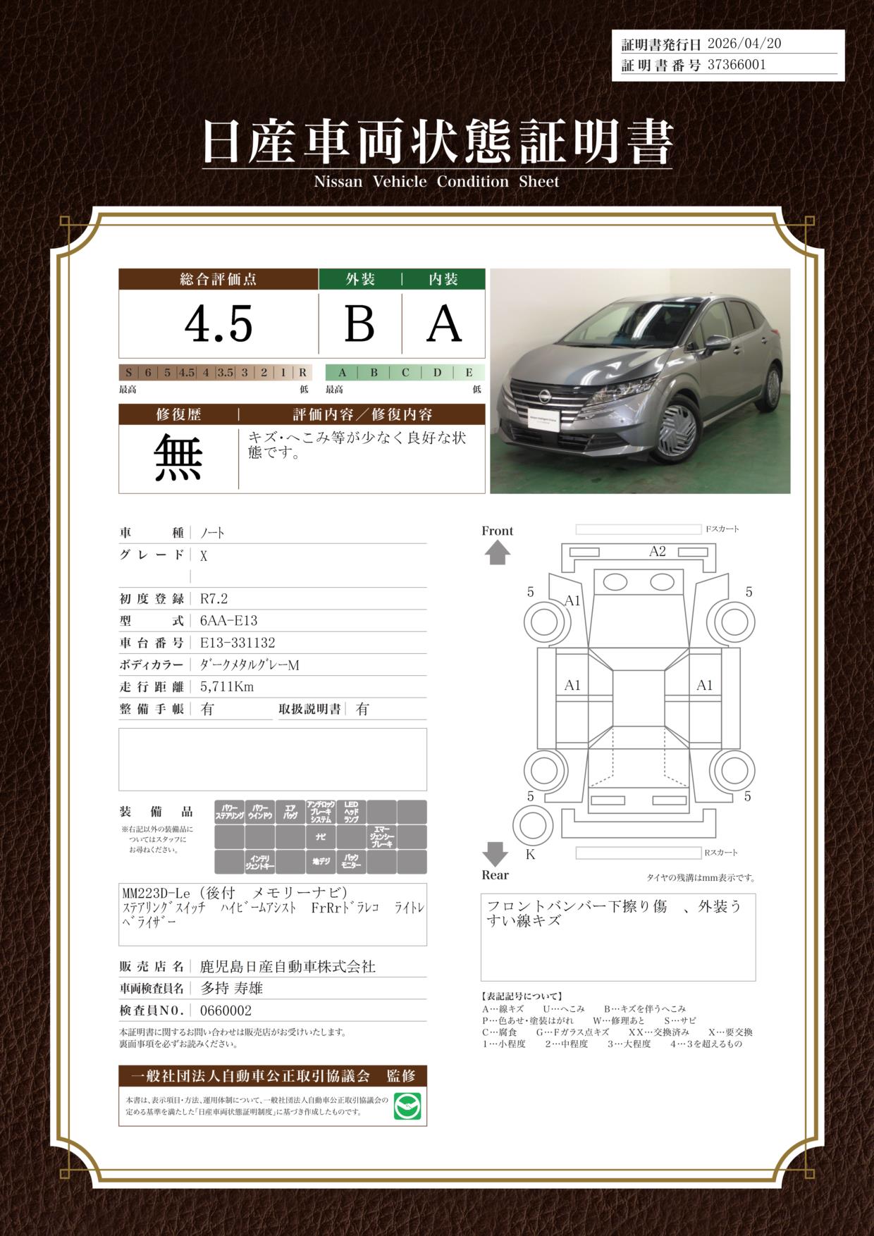 「車両状態証明書」は、査定協会監修のプロの検査員が公正かつ確かな基準で検査した”安心の証”です。