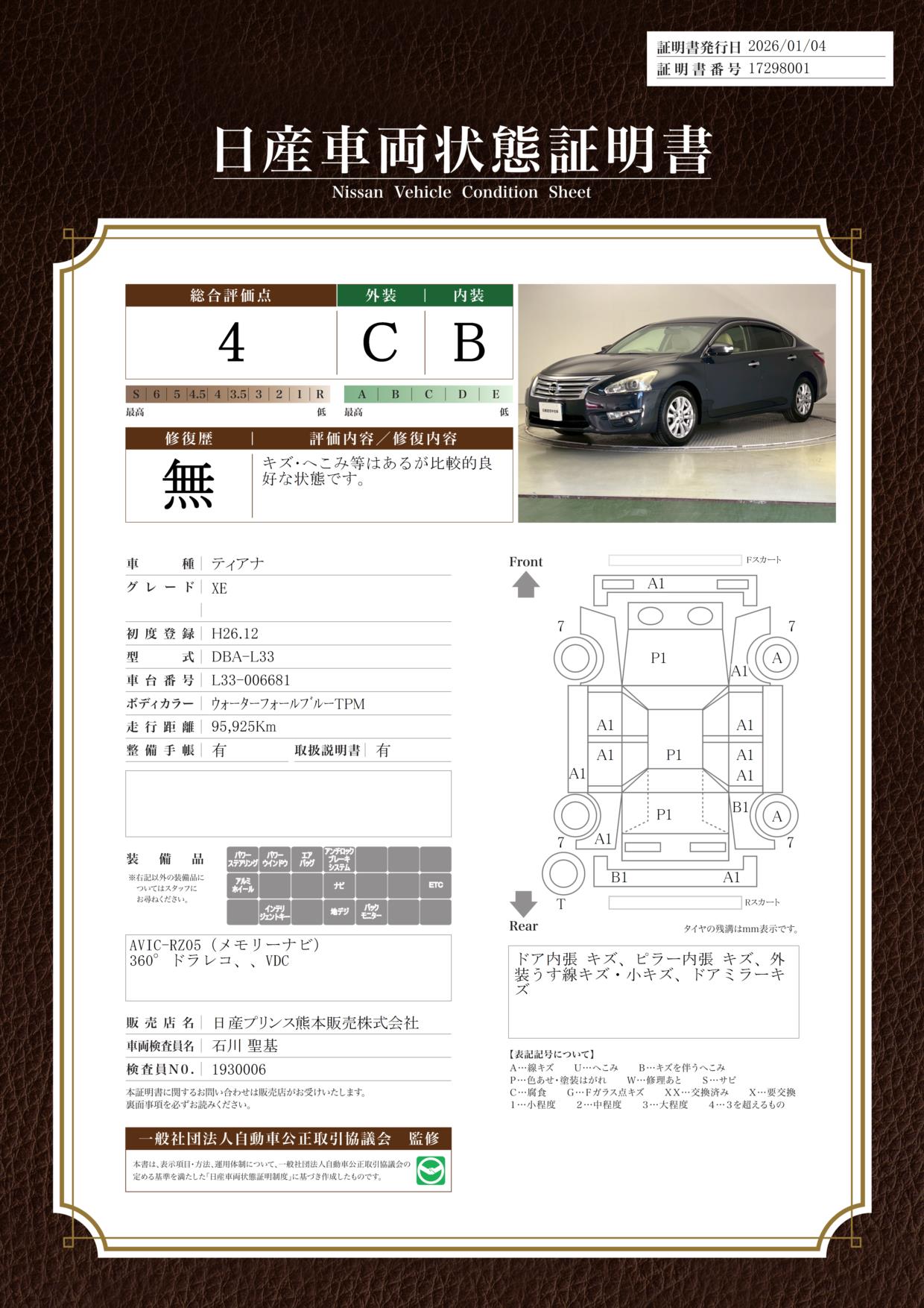 現状括弧書き内の年月まで車検有効期限が残っていますが、ご成約時に新しく車検を取り直します。なお取り直しの費用は車両価格に含まれています。