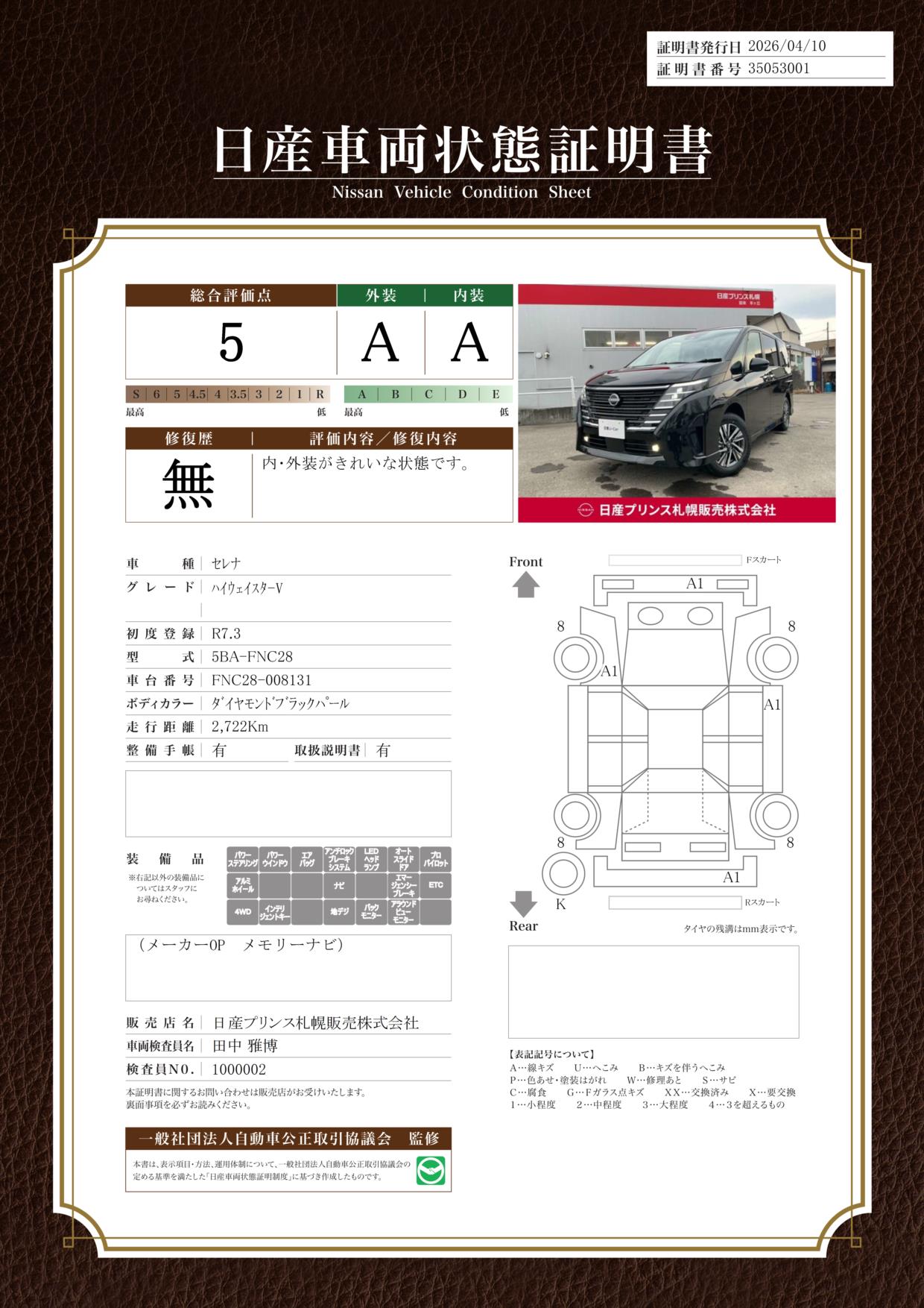 「車両状態証明書」は、査定協会監修のプロの検査員が公正かつ確かな基準で検査した”安心の証”です。