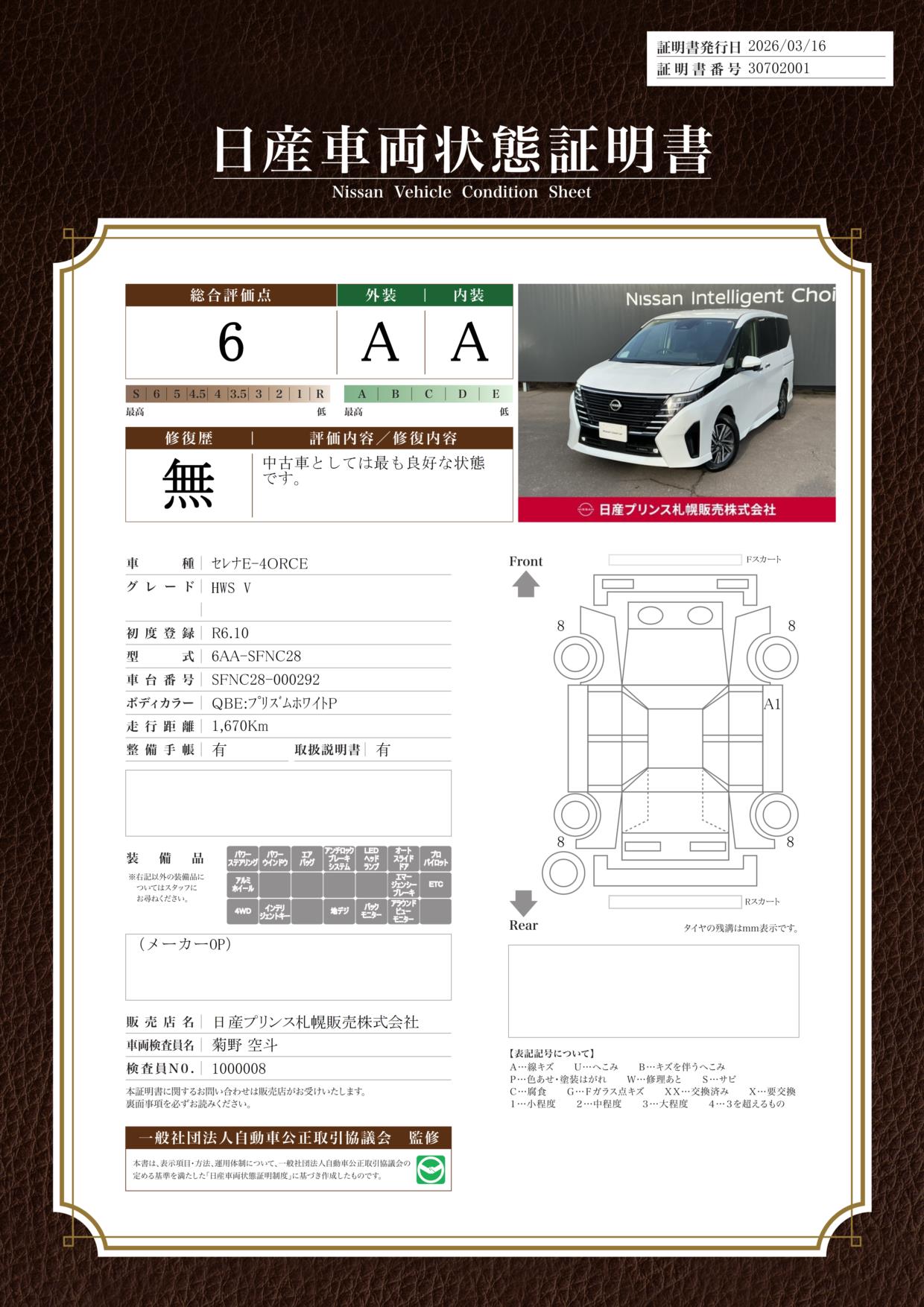 「車両状態証明書」は、査定協会監修のプロの検査員が公正かつ確かな基準で検査した”安心の証”です。