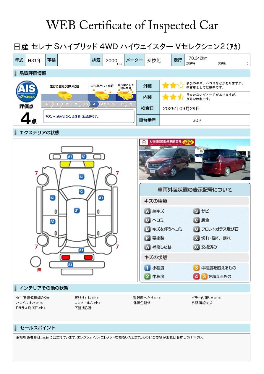 くるまるく八軒の店舗紹介ページをご覧頂きありがとうございます。 ■当店はディーラーならではの高品質なお車をバリエーション豊富に展示中 ■自社整備工場も完備しておりますので、メンテナンスも安心 ■全車走行メーター管理システム導入(日本オートオークション協議会) ■AIS評価書付車両(第三者評価書)も多数ございますので、ご安心ください ■日産「ワイド保証」で「1年間走行距離無制限」の「無料保証付」