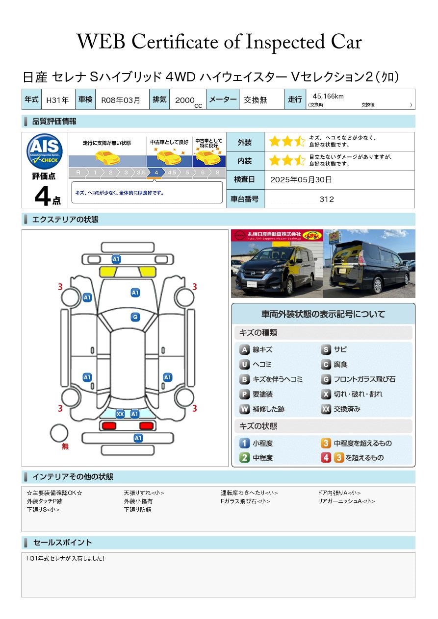セレナ 2000cc 2.0 ハイウェイスターV 4WD 法定12ヶ点検整備渡しです!
