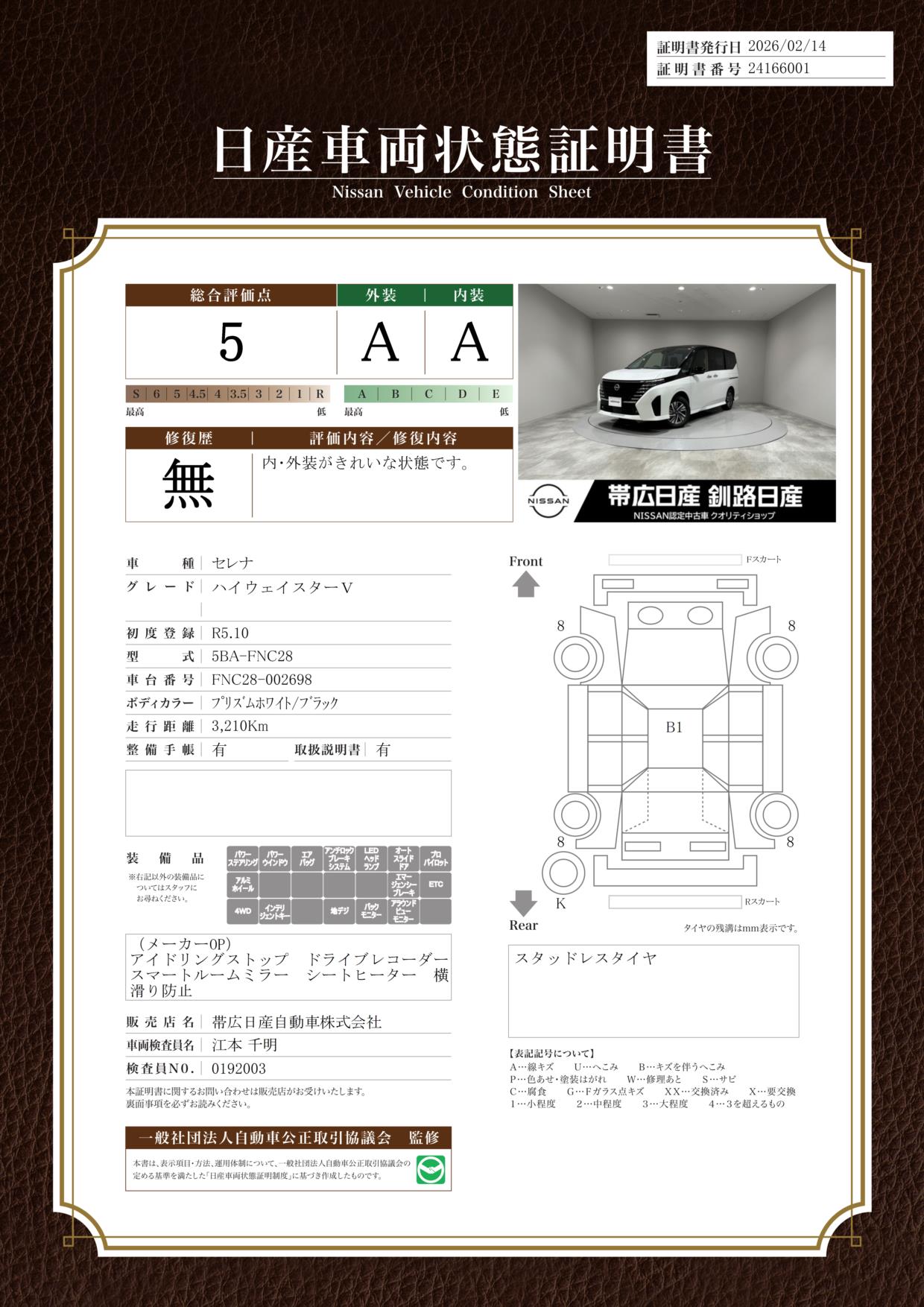 現状括弧書き内の年月まで車検有効期限が残っていますが、ご成約時に新しく車検を取り直します。なお取り直しの費用は車両価格に含まれています。