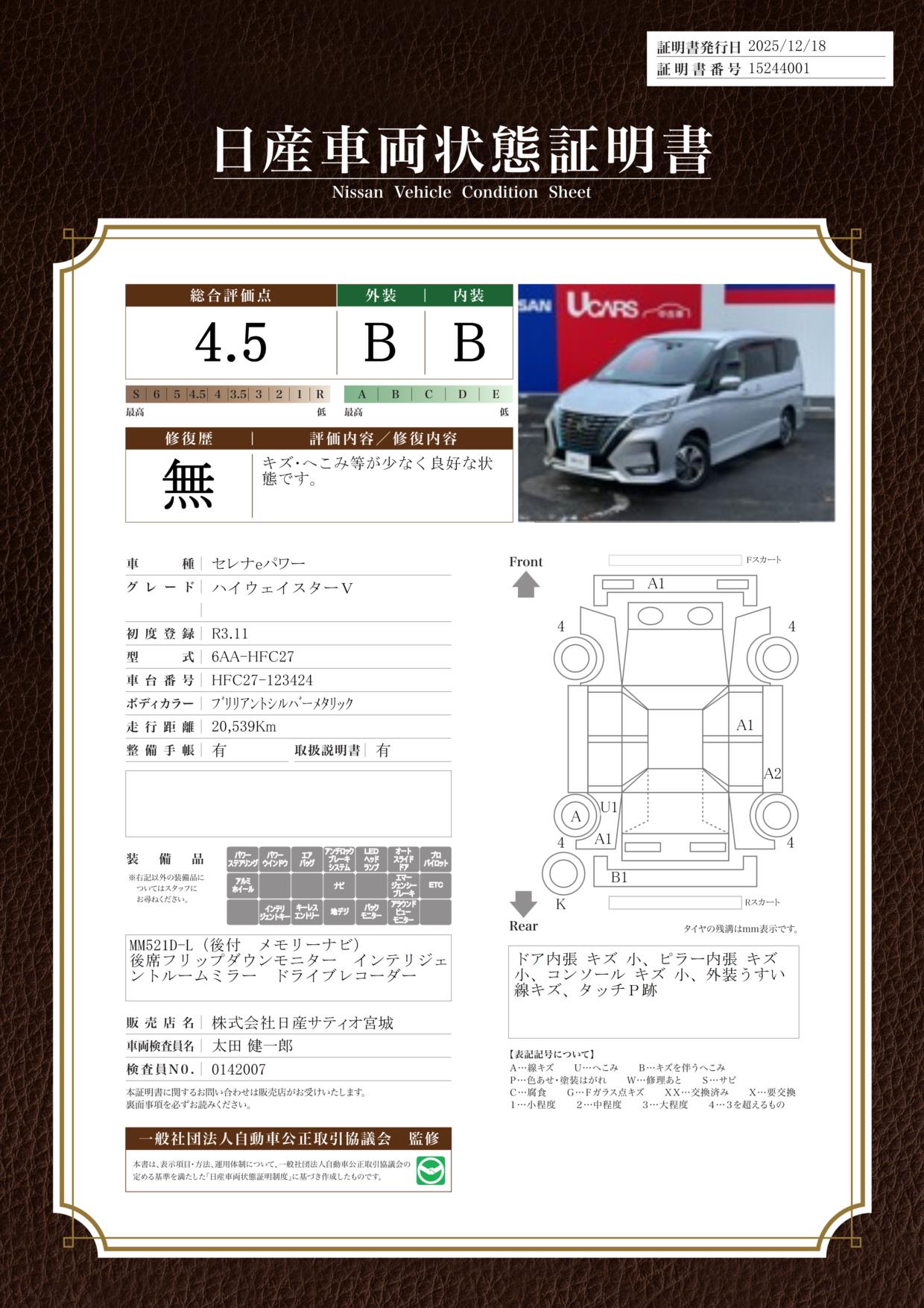 評価機関 : 日産車両状態証明