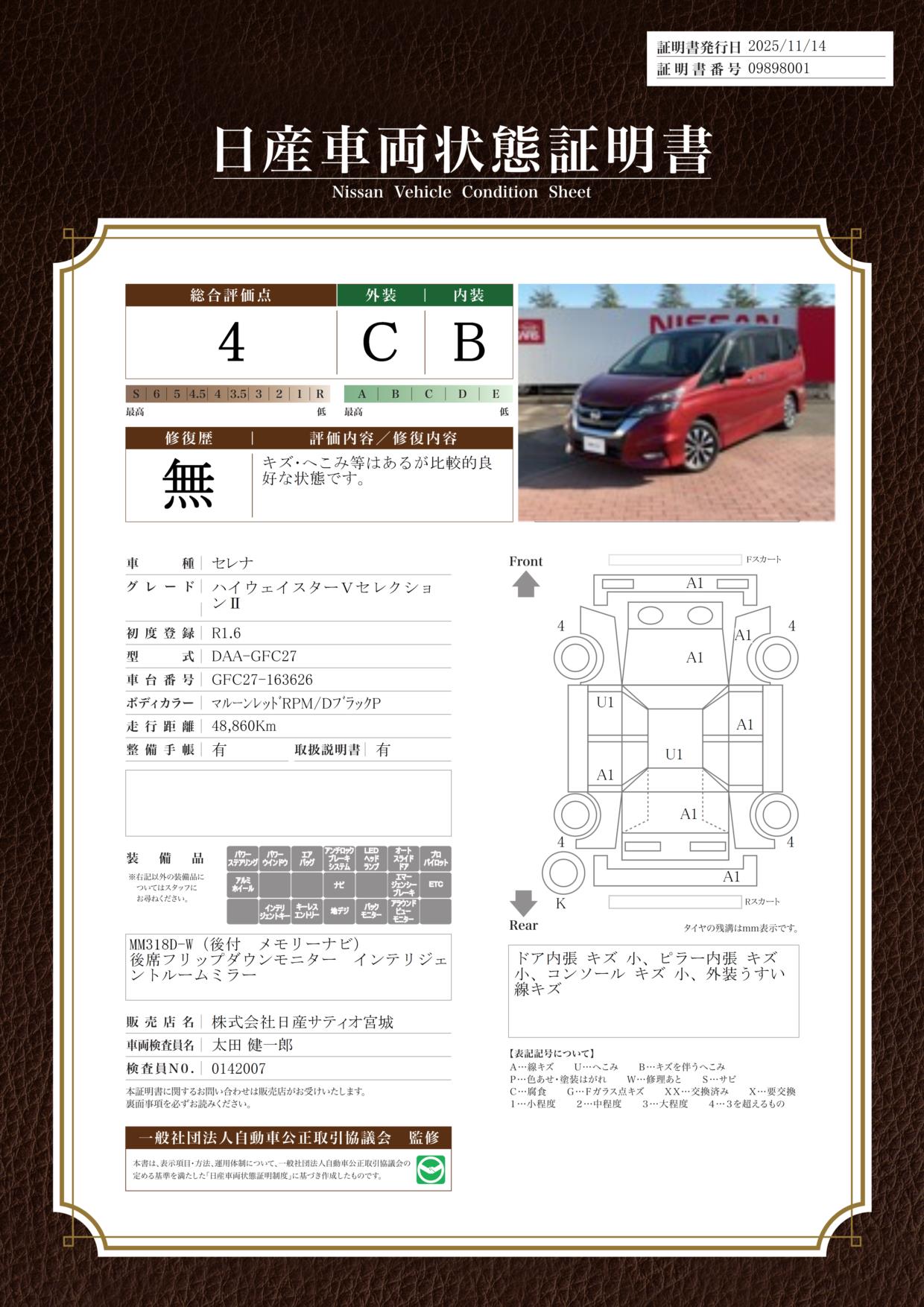 現状括弧書き内の年月まで車検有効期限が残っていますが、ご成約時に新しく車検を取り直します。なお取り直しの費用は車両価格に含まれています。