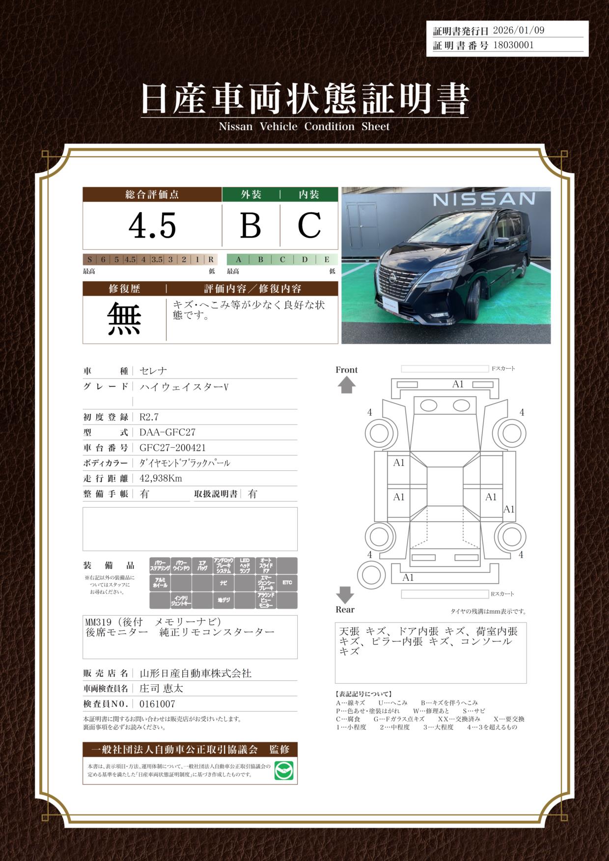 評価機関 : 日産車両状態証明