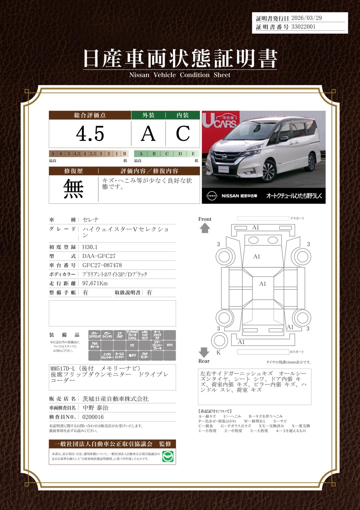 現状括弧書き内の年月まで車検有効期限が残っていますが、ご成約時に新しく車検を取り直します。なお取り直しの費用は車両価格に含まれています。