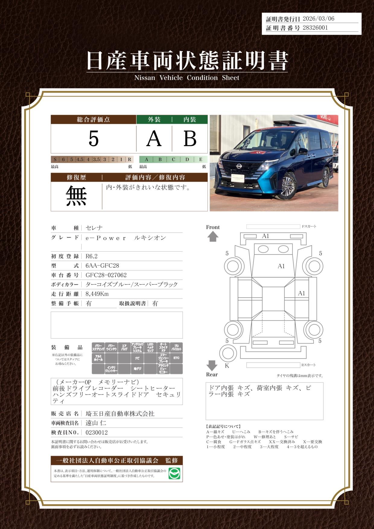 「車両状態証明書」は、査定協会監修のプロの検査員が公正かつ確かな基準で検査した”安心の証”です。