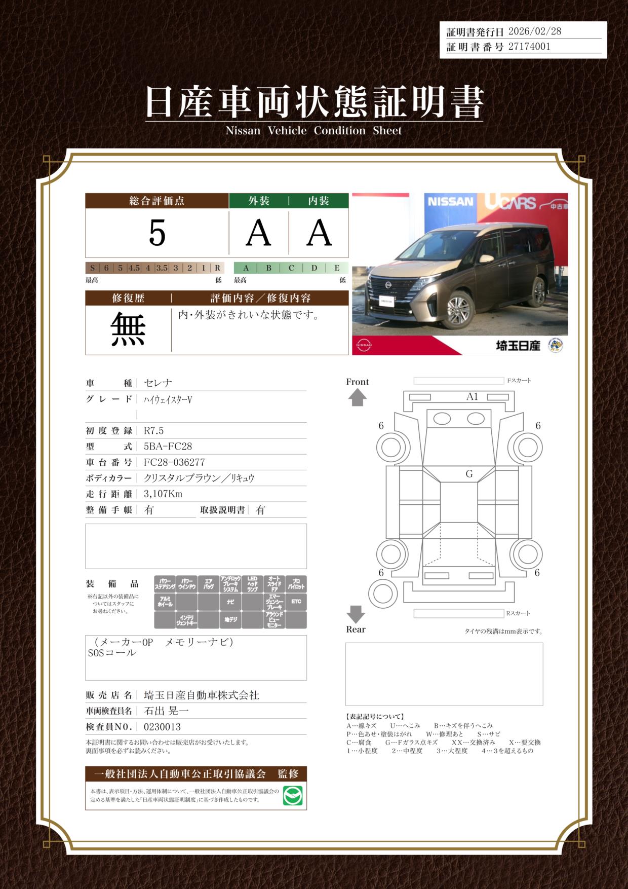 「車両状態証明書」は、査定協会監修のプロの検査員が公正かつ確かな基準で検査した”安心の証”です。